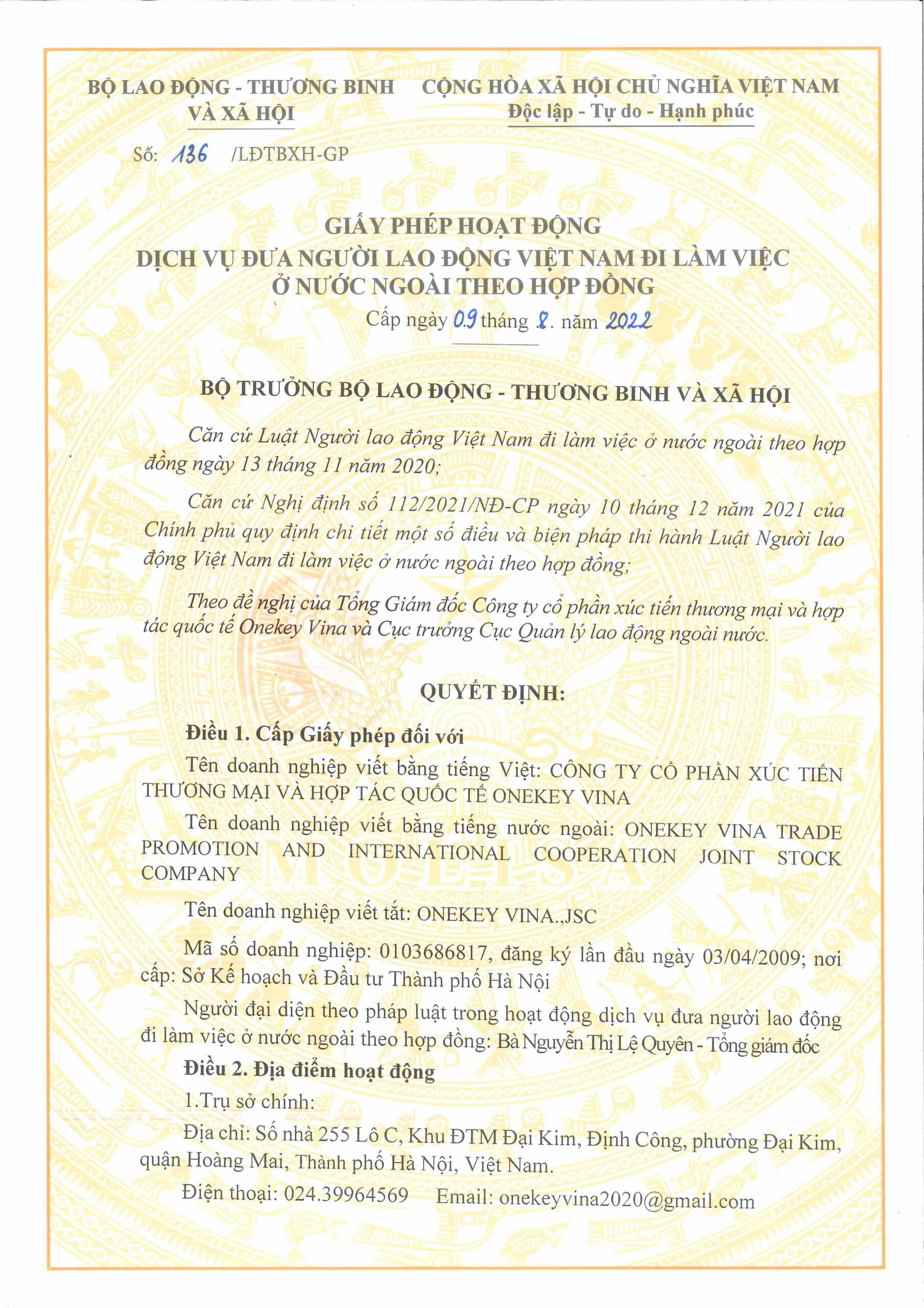 Công ty Cổ phần xúc tiến thương mại và Hợp tác Quốc tế Onekey vina đã được sở Kế Hoạch và Đầu tư Thành Phố Hà Nội cấp giấy chứng nhận đăng ký kinh doanh lần đầu số 0103686817 cấp ngày 03/04/2009. Đăng ký thay đổi lần thứ 11 ngày 04/12/2020. Công việc chính là cung ứng nhân lực đi làm việc ở nước ngoài theo hợp đồng có thời hạn.